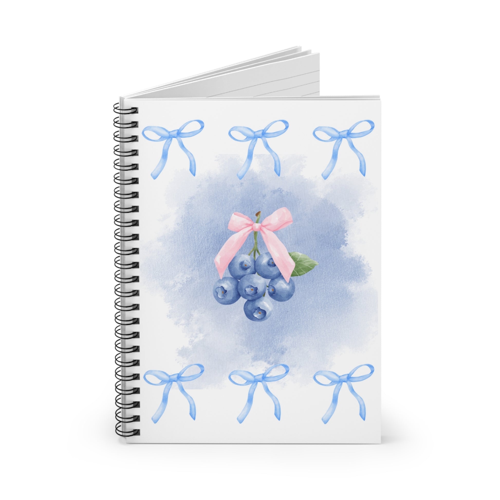 An aesthetic notebook with a blueberry, blue bows, and a blue cloud graphic on the front cover. Perfect for those who love fruit, blueberries, unique and creative stationery items. Great for journaling, note-taking, shopping lists, and doodling. Ideal for students, artists, and anyone who appreciates a beautifully designed notebook. Our "Cute Blueberry" notebook is perfect for back to school, moms, a thoughtful gift, and work.