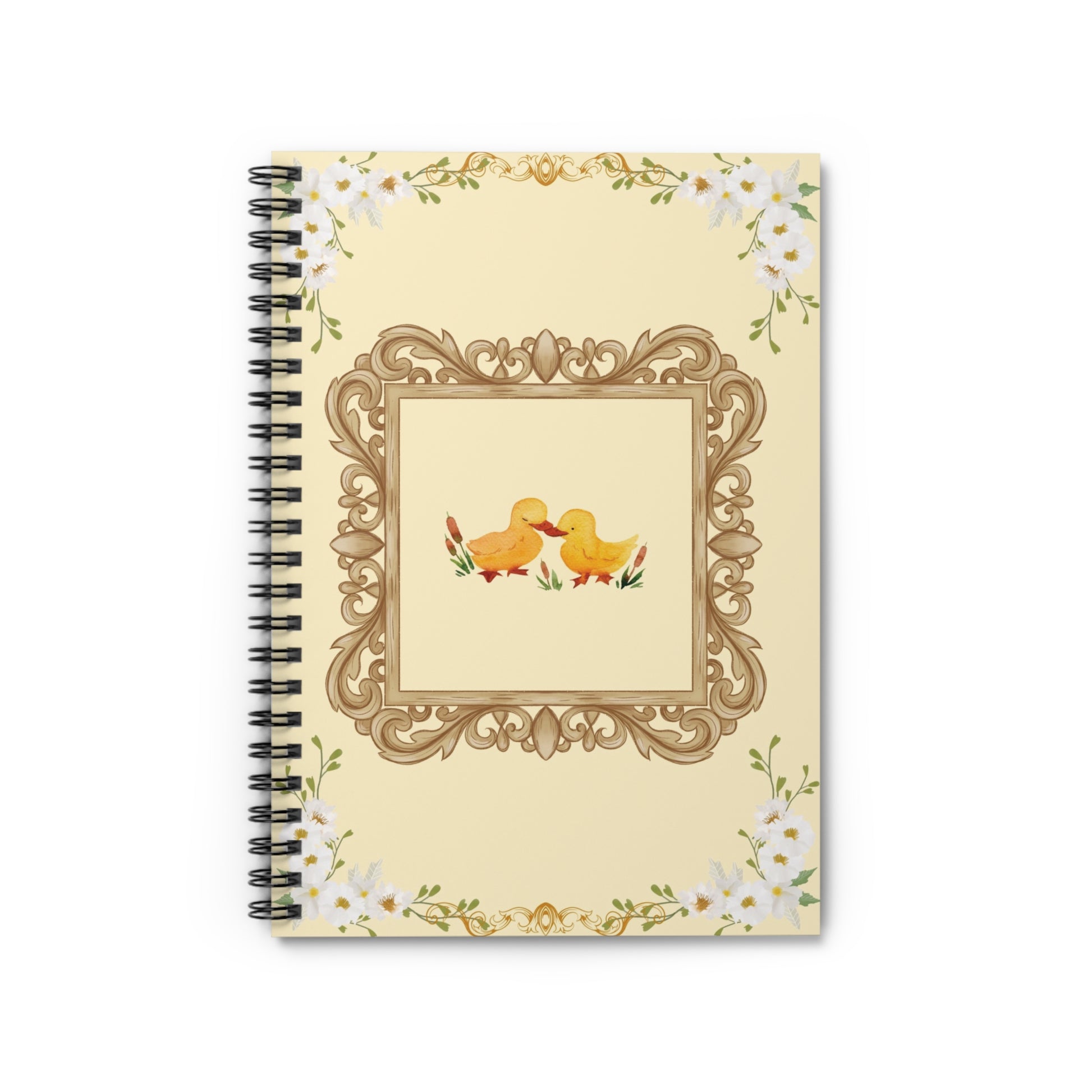 Warm, gentle, and full of storybook charm, the Darling Duck Notebook features two sweet ducklings framed in an ornate vintage-style design, surrounded by delicate florals and soft golden details set against a cozy yellow pastel background. Designed for lovers of cottage-inspired aesthetics, vintage elegance, ducks, and soft, details. This design captures the innocence of spring mornings and the comfort of simple joys. Perfect for journaling, note-taking, lists, Planning or creative writing.