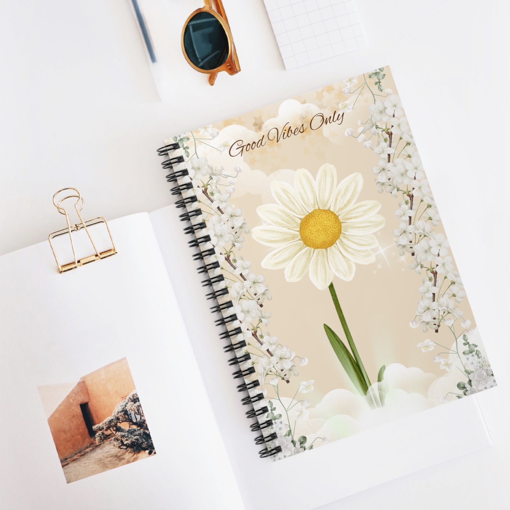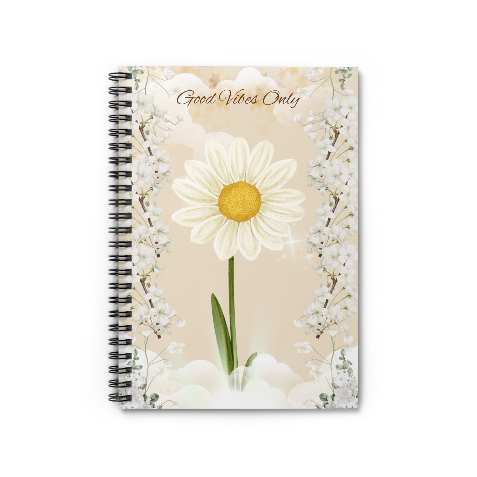 A beautiful notebook with a light yellow/beige aesthetic background, flowers, Clouds, and "Good Vibes Only" written on it. This notebook is perfect for everyday life, shopping lists, school notes, journaling, or poems.