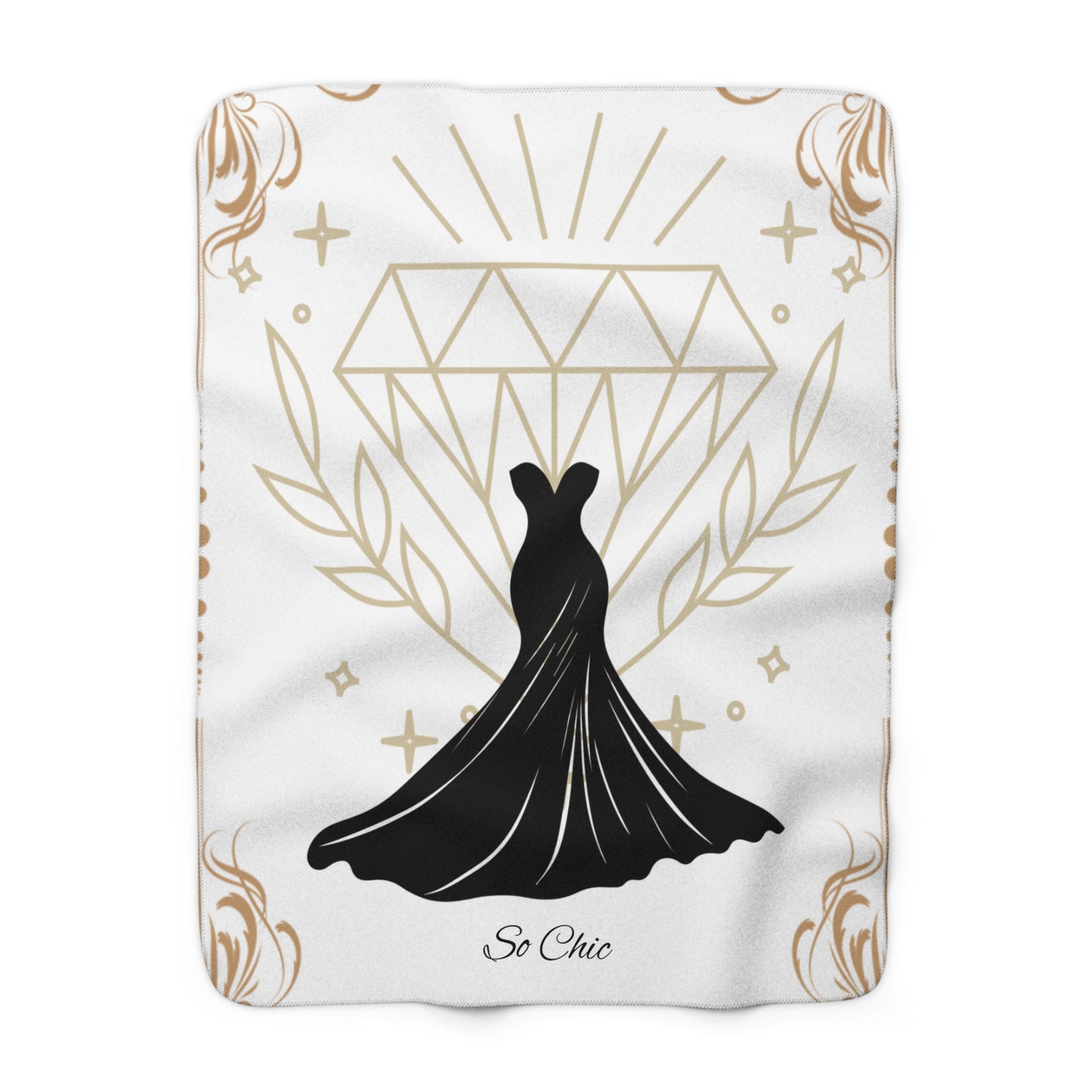 A warm and chic aesthetic blanket, this high-quality cozy fleece blanket is impossible to leave behind wherever one might go. A White blanket with a Diamond, gold trims, and a black dress graphic with "So Chic" written on the bottom of the blanket. Perfect for decorating your room, sleepovers, cuddling on the couch, or special gifts.