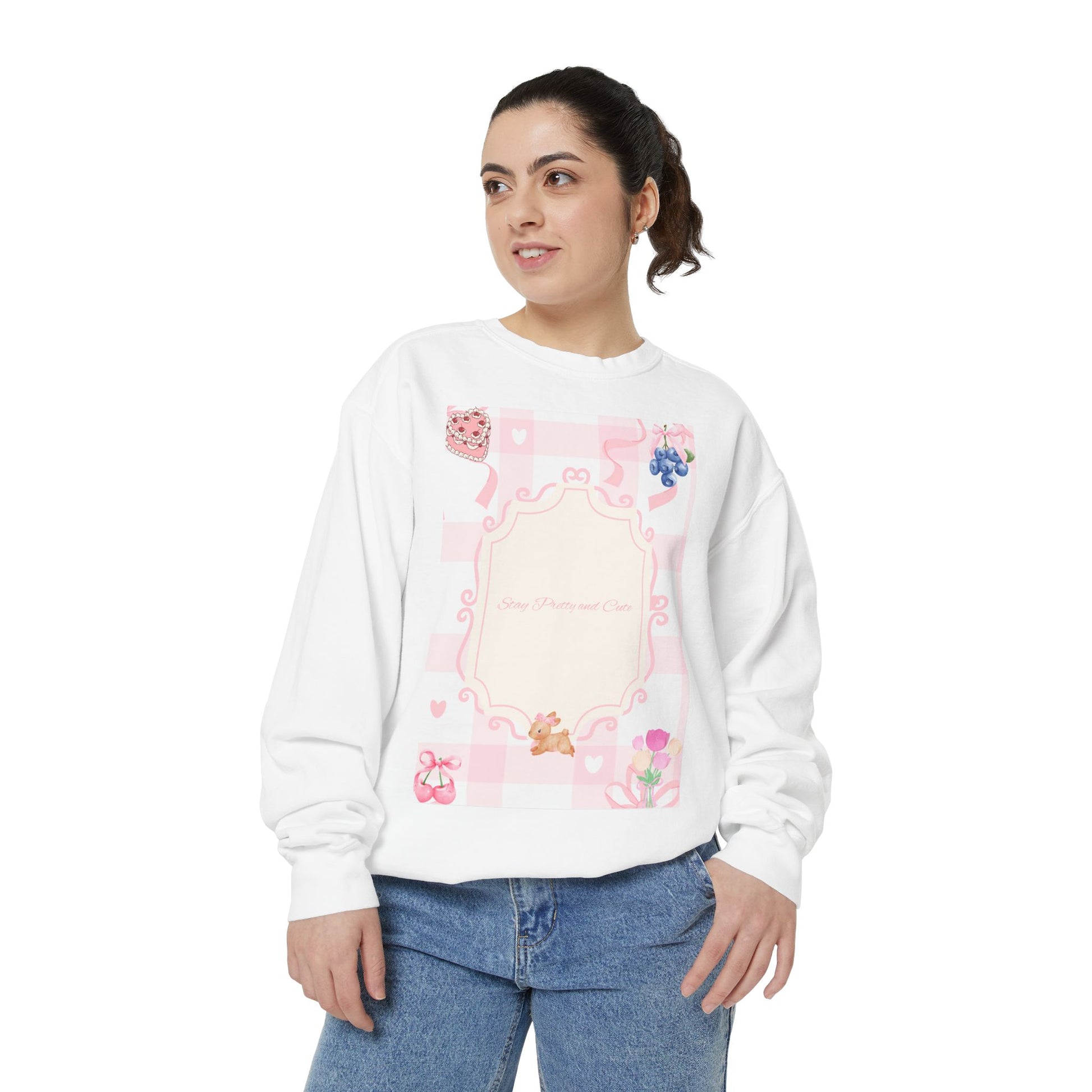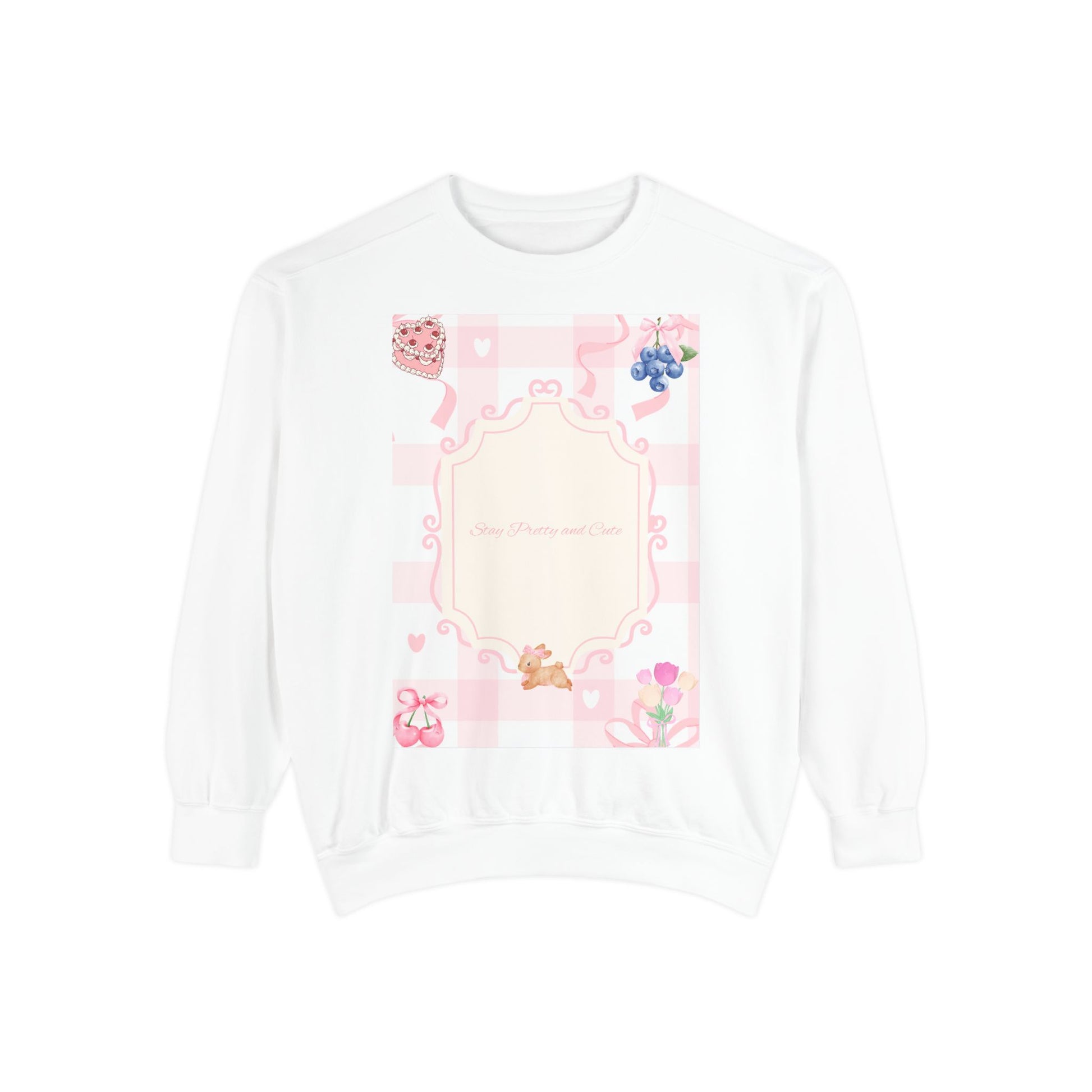 A cozy sweatshirt with a pink plaid picnic aesthetic graphic, fruit, lace, and flowers around it. This uniquely designed graphic sweatshirt is perect for cold days, shopping, school, movie nights, picnics, and more. Each sweatshirt comes with a relaxed fit, a rolled-forward shoulder, and a back neck patch.